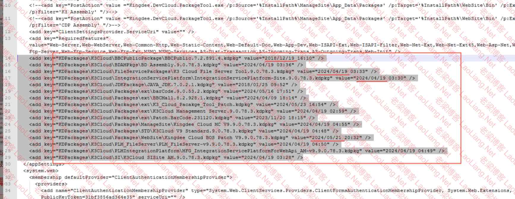 想看时间到底哪里问题,然而就去找了一下配置文件检查产品安装包解压后的KDsetup文件夹中的kingdee.k3.setup.exe.config文件中,这个文件里定义了这些包的时间;