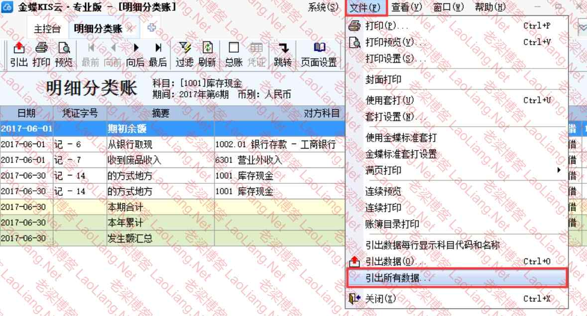 2、单击【文件】→【引出所有数据...】,打开【引出明细分类账】窗口;