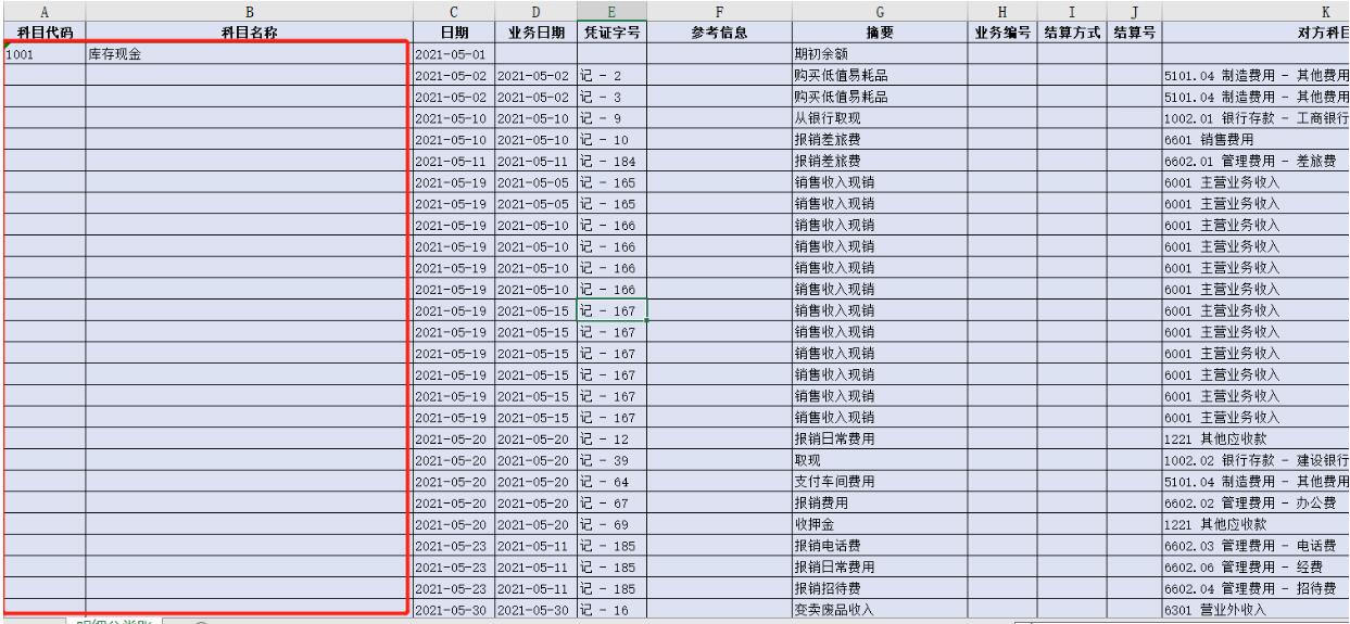 下图为勾选“引出数据每行显示科目代码和名称”的数据: