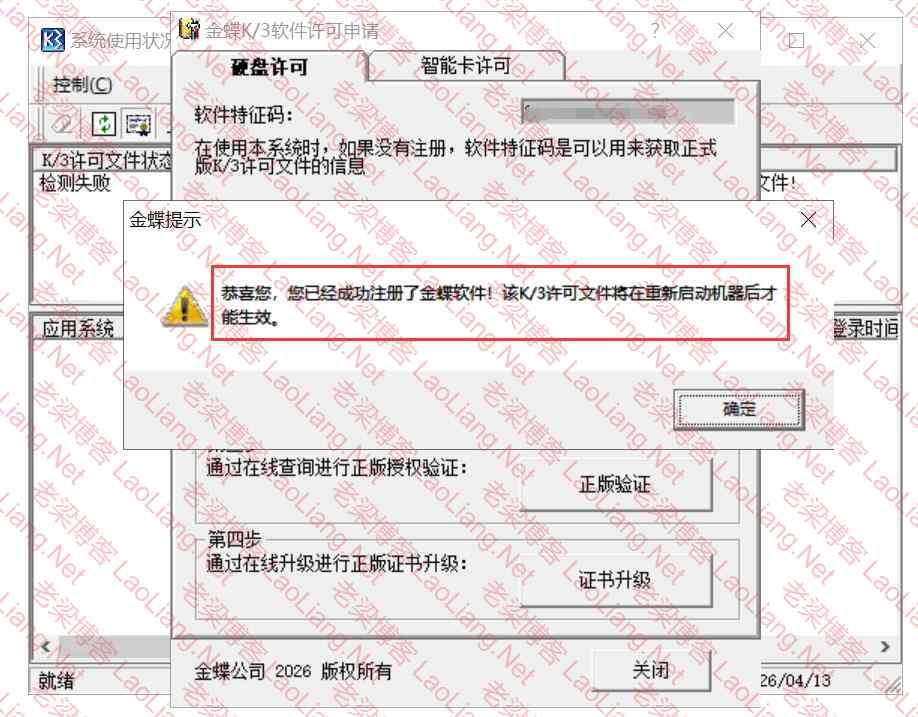 恭喜您,您已经成功注册了金蝶软件!该K/3许可文件将在重新启动机器后才能生效。