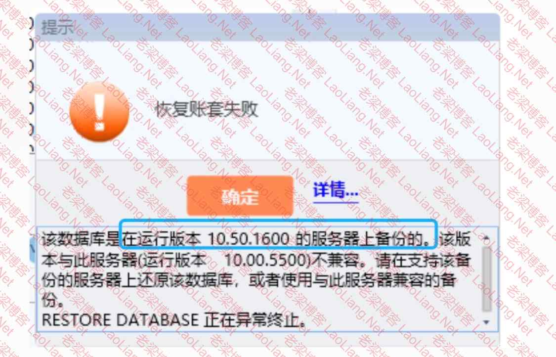 有网友金蝶kis专业版出现了故障,重装金蝶kis专业版软件,安装完成后恢复账套,却提示“该数据库是在运行版本10.50.1600的服务器上备份的。该版本与此服务器运行版本10.00.5500不兼容,请在支持该备份的服务器一还原该数据库,或者使用与此服务器兼容的备份”,如下图所示