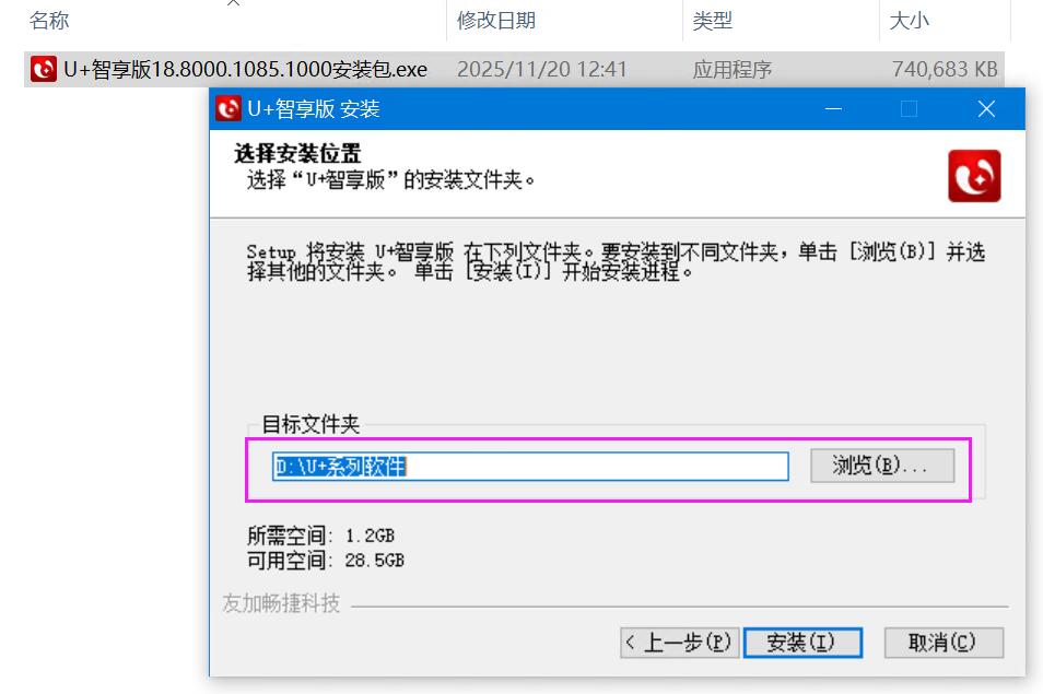 2、右键管理员模式运行“U+智享版18.8000.1085.1000安装包”进行安装即可,然后选择安装的路径