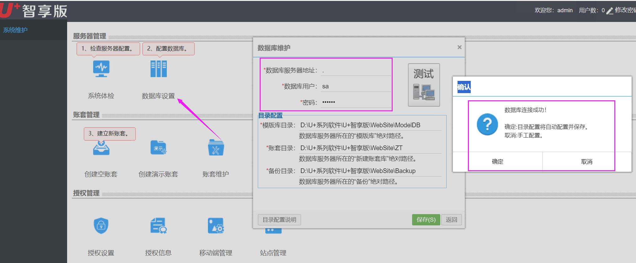6、设置一下“设置运维平台管理员账户”,然后就可以登录进去,进入后设置一下数据库信息,测试成功,下面的“目录配置”就自动出现!