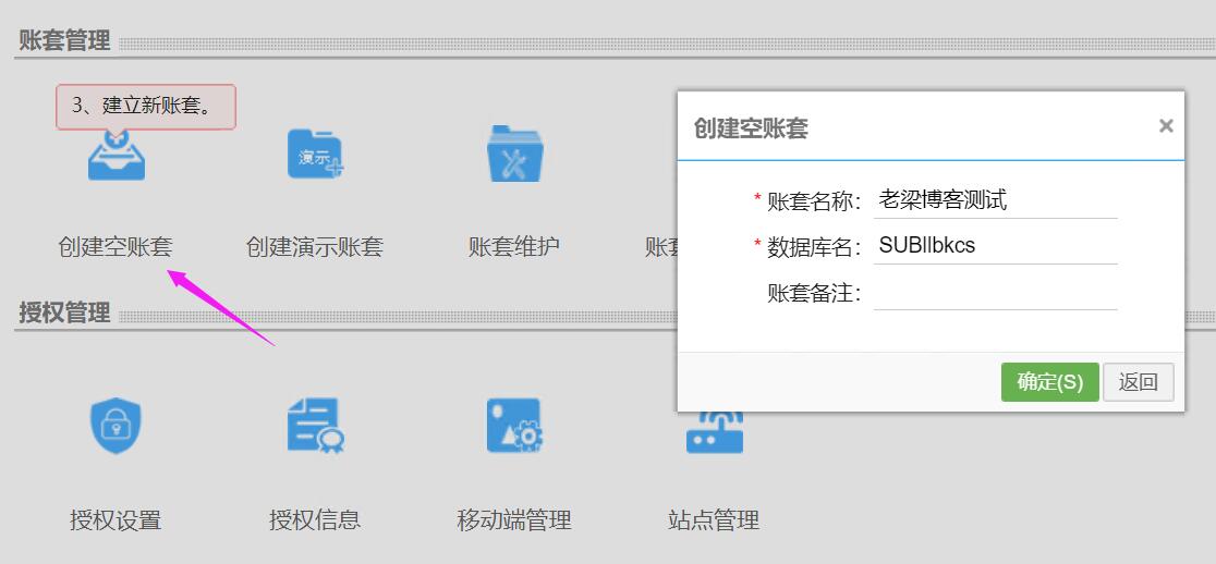 7、设置好数据库,然后开始创建新账套即可~~“说明:账套名称可以为中文,但是数据库名切不可为中文哦”~~