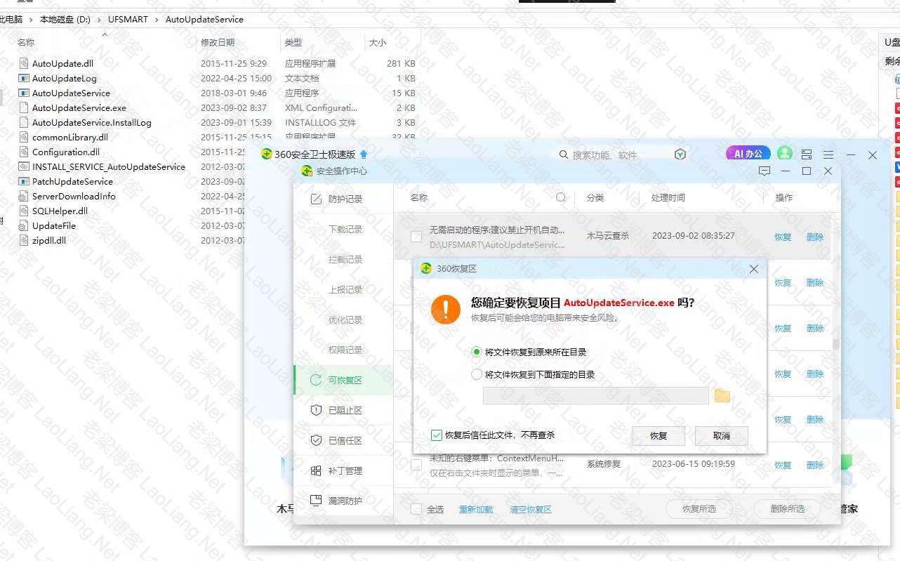 客户AutoUpdateService文件丢失就是被360杀毒软件吃了,如下图所示
