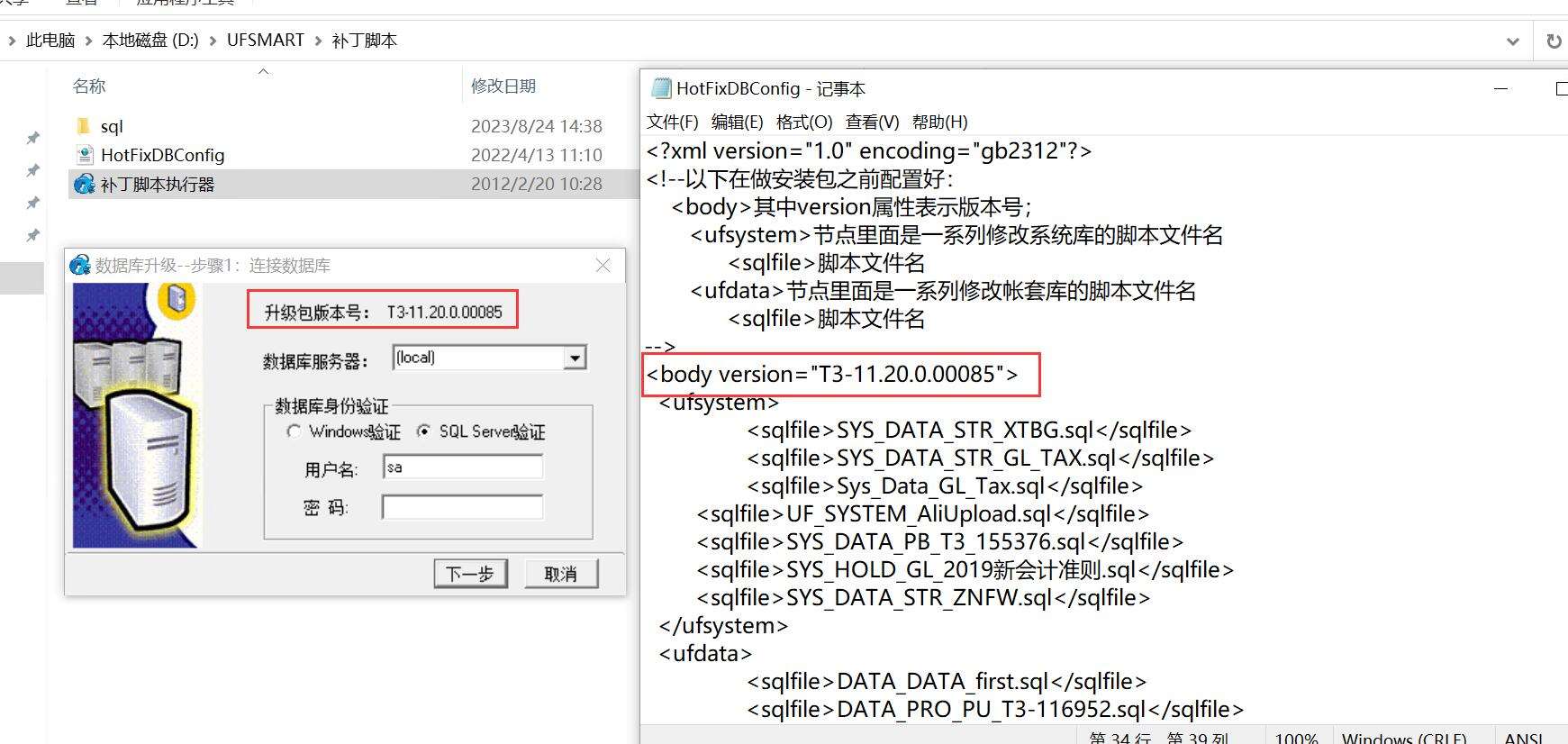 主要是“X:\UFSMART\补丁脚本\HotFixDBConfig.xml与补丁脚本执行器”里查询一下相关的版本,如下图所示