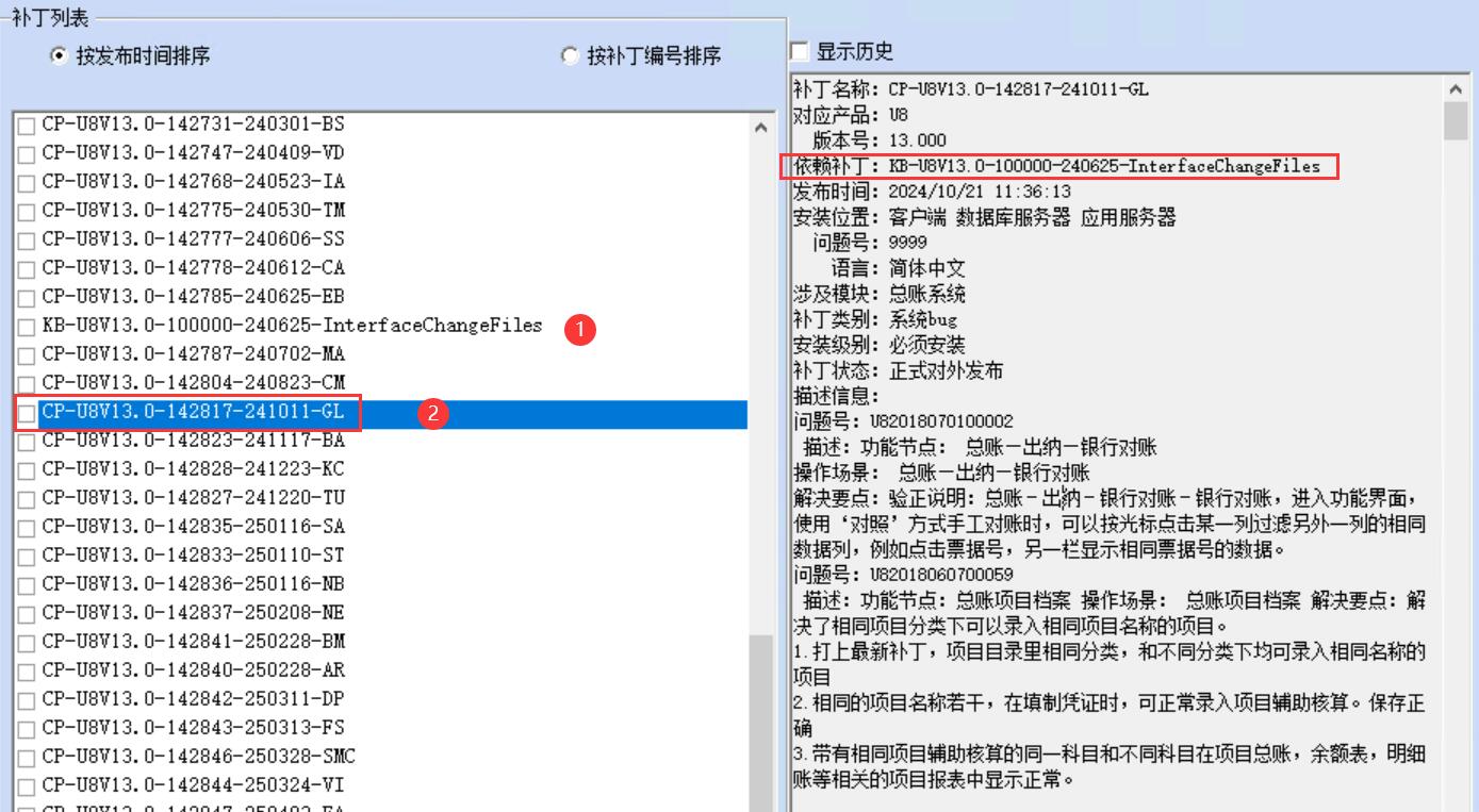其实在这个补丁的时候还有一个补丁,打总账补丁CP-U8V13.0-142817-241011-GL要先打前置依赖补丁KB-U8V13.0-100000-240625-InterfaceChangeFiles方可,