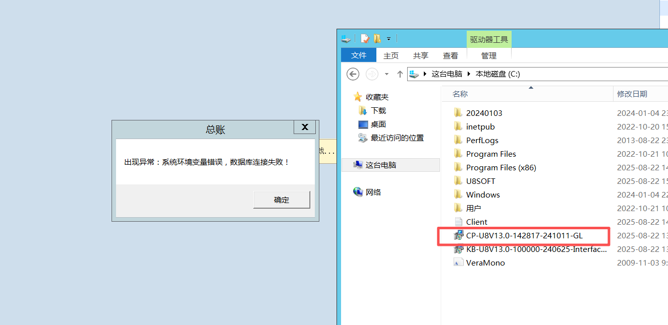 今天有群里大佬打了用友U8+13.0打完总账补丁CP-U8V13.0-142817-241011-GL提示“总账-出现异常:系统环境变量错误数据库连接失败!”,如下图所示