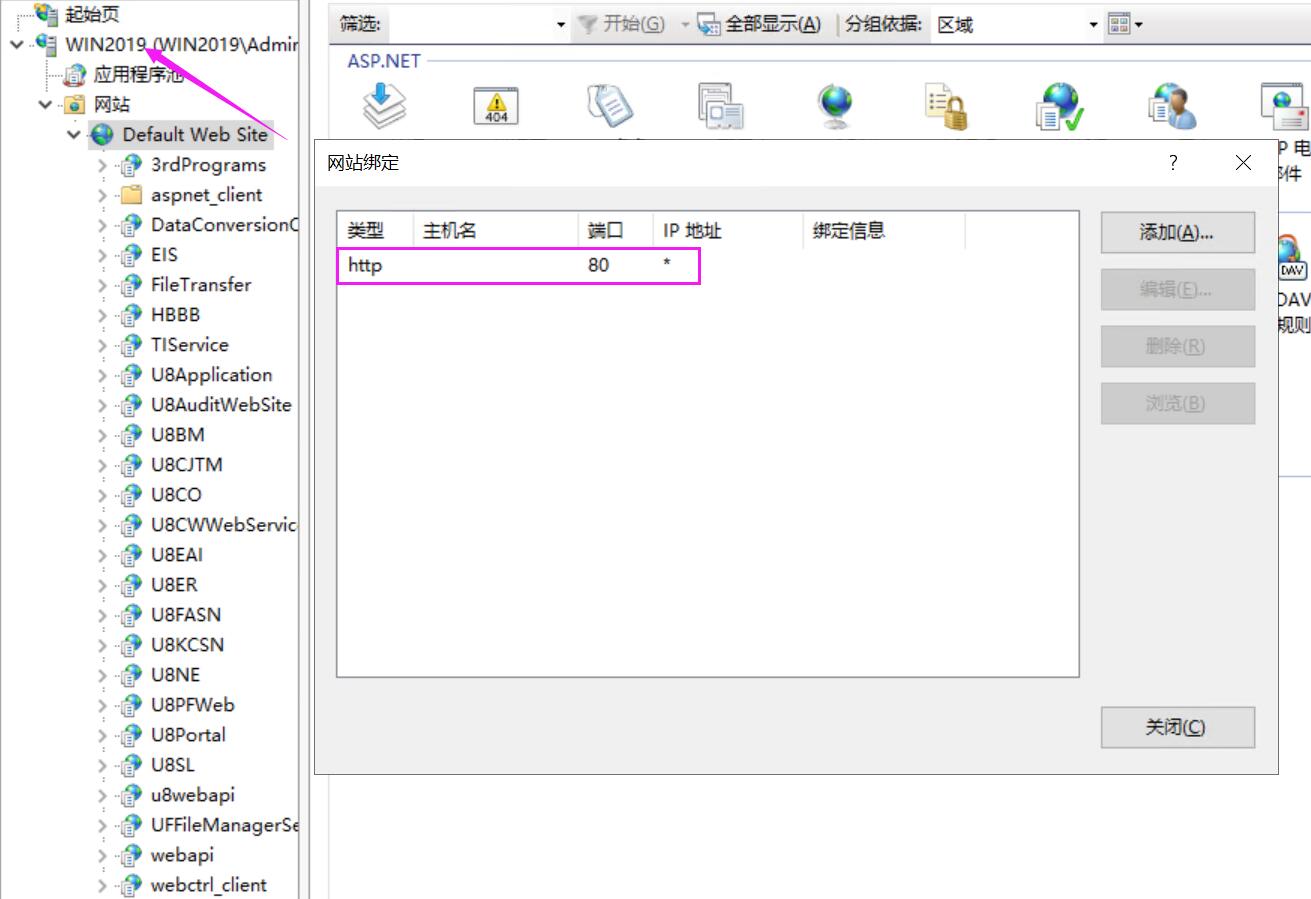②、检查iis网站是否启动,iis是否更换端口,如下图所示