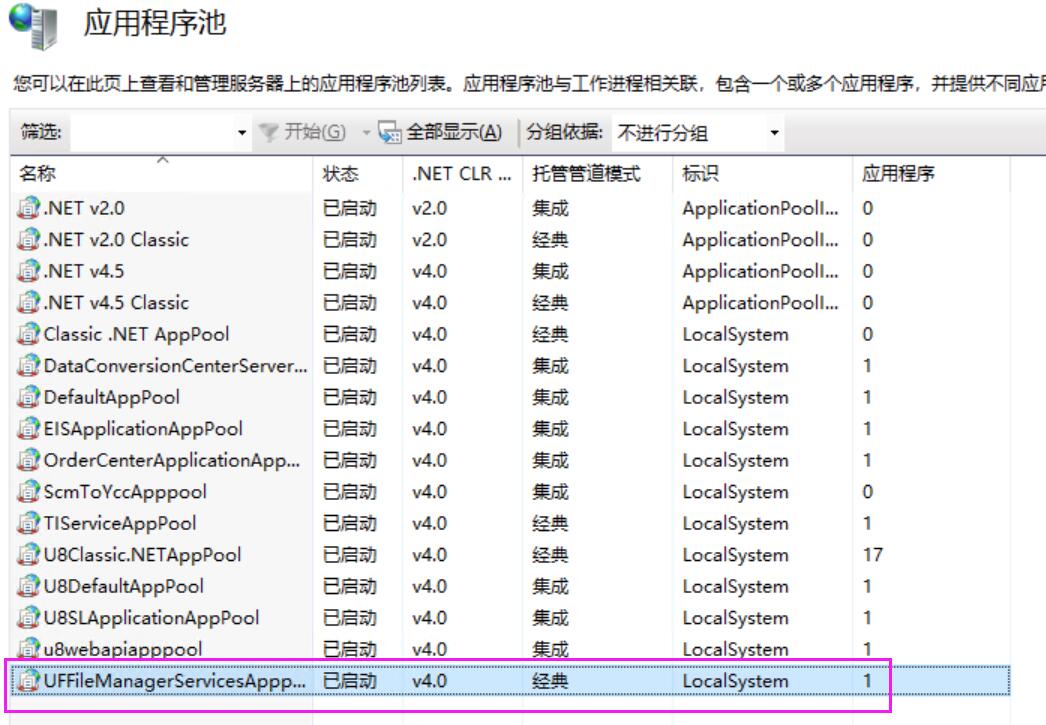 ③、检查文件服务器应用程序池(UFFileManagerServicesApppool)是否运行 .NET CLR版本(4.0其实就是4.5、4.8类型)与托管管道模式(经典)是否正确;