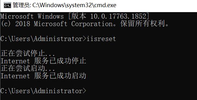 ①、Internet服务不正常,重启iis尝试(管理员身份运行cmd执行指令iisreset)如下图所示