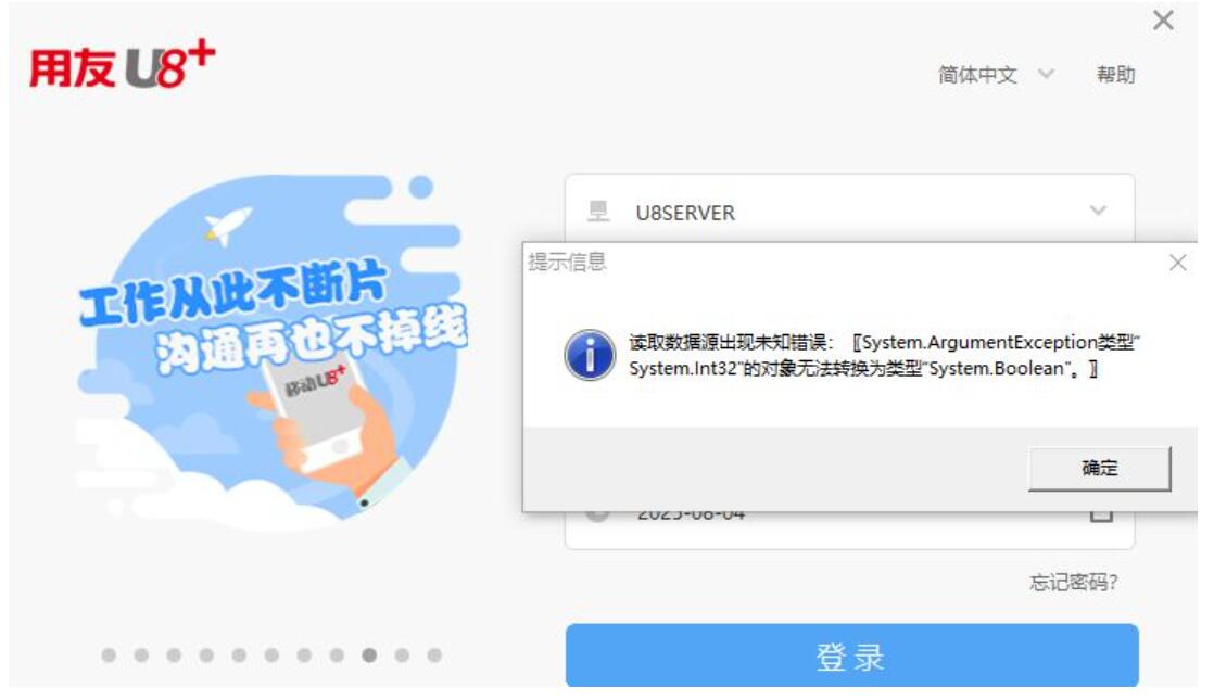 登录用友U8+16.1客户端提示“读取数据源出现未知错误System.ArgumentException类型System.Int32的对象无法转换为类型System.Boolean“的说明