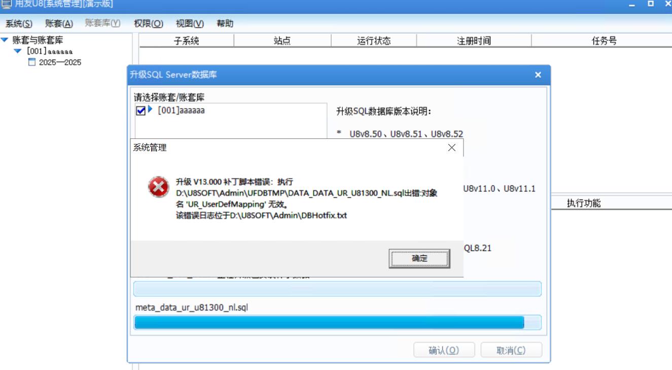 记录且未弄明白:用友U8+13.0升级“CP-U8V13.0-142856-250922-UR”补丁提示UFDBTMP\DATA_DATA_UR_U81300_NL.sql出错:对象名 'UR_UserDefMapping' 无效