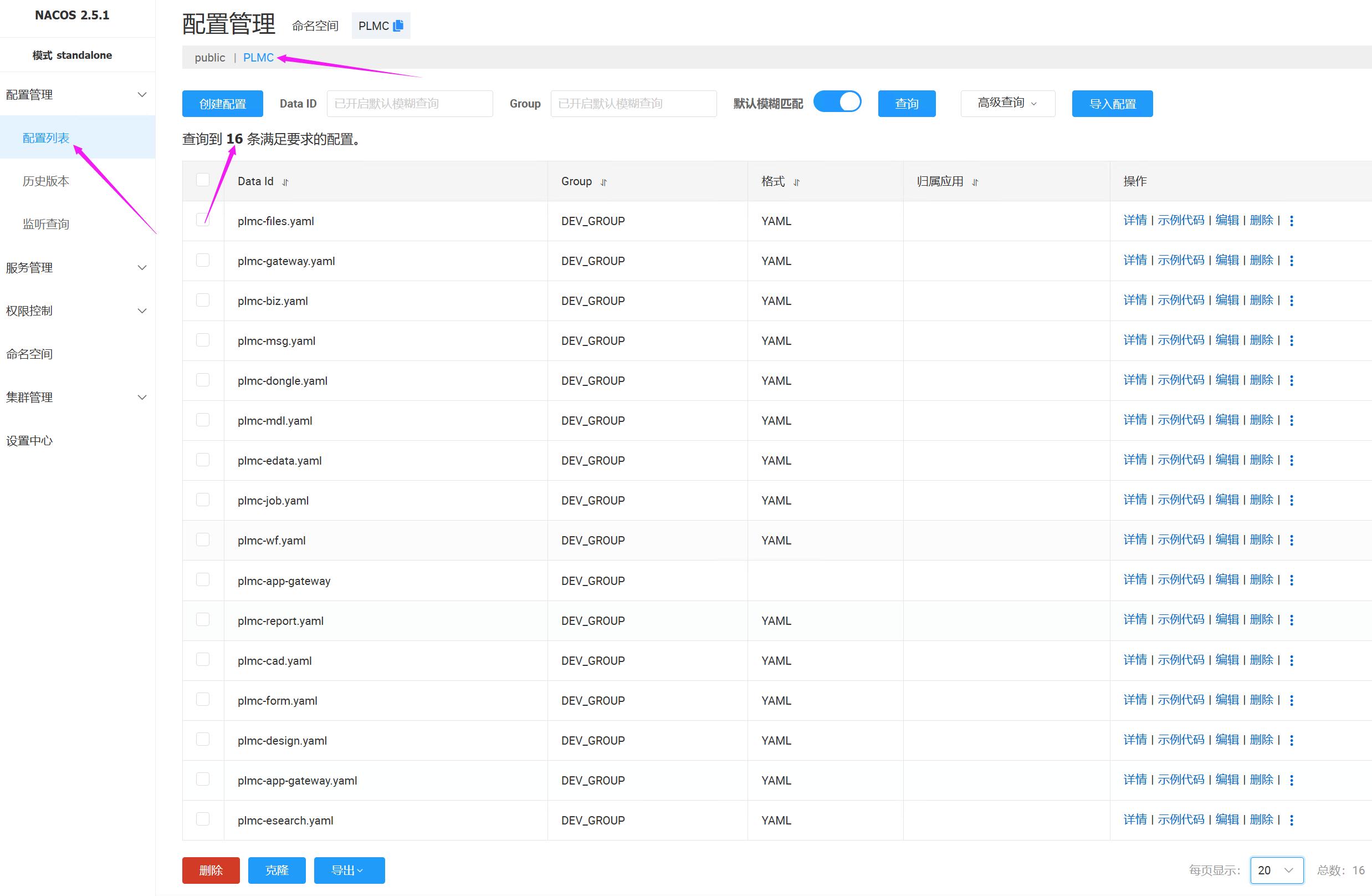 以下分组名称全部为“DEV_GROUP”,格式为“YAML”
