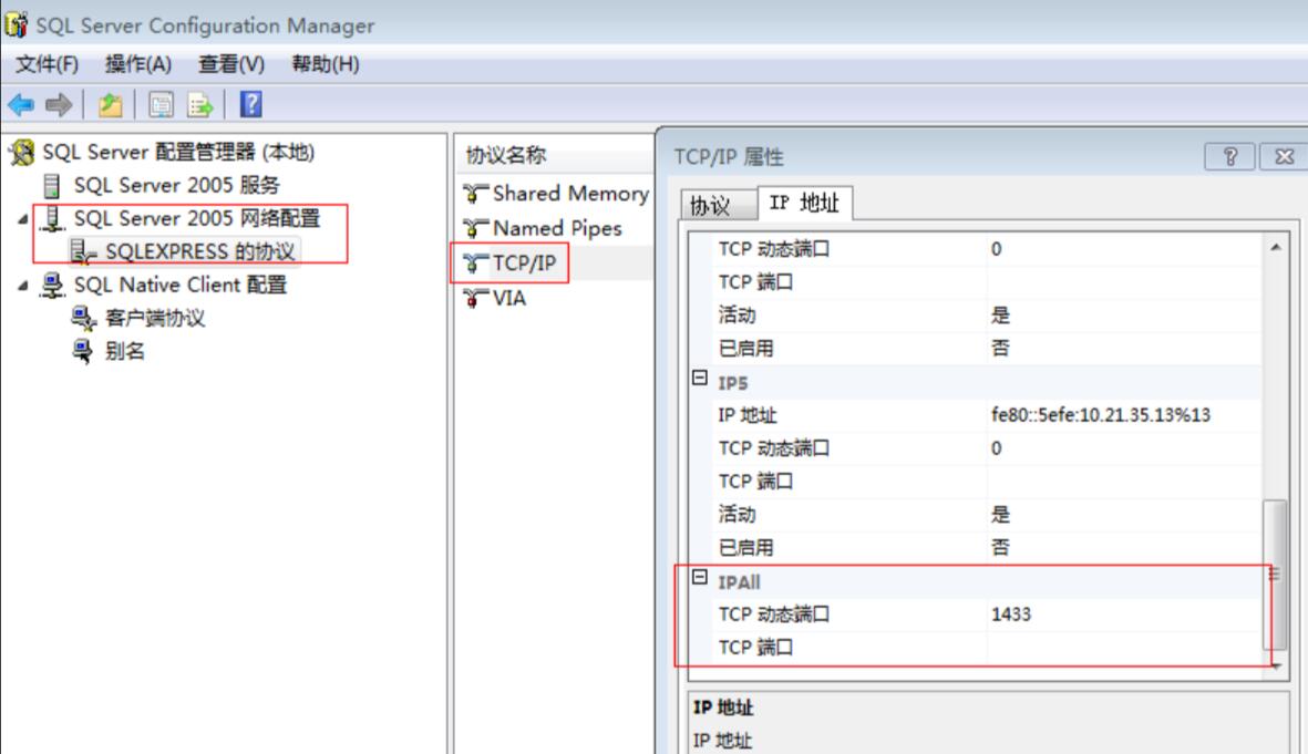 1、展开 SQL Server 2005/2008 网络配置节点 -->展开协议节点 --> 在协议右边启用 TCP/IP 协议 -->在协议右边的 TCP/IP 协议属性中 --> 在 IPAll 这一项-->将 TCP 端口设置为 1433,如下图: