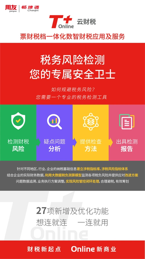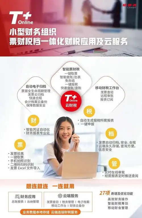 T+Online云财税,是一款全新体验的票财税档一体化数智财税工具应用及云服务产品。融合人工智能、移动技术、数据分析等技术,向微型企业客户提供移动管理、电子发票、电子档案、智能财税等应用及服务,满足企业内部智能管理、财税协同的全新数字化服务系统。该应用及云服务主要针对已经渡过企业初创阶段,并且进入快速成长阶段的小微企业财务组织的财会管理需要,满足小微企业财务人员快速准确核算,以票控税,高效合规的管理诉求,全面提升票、财、税、档管理水平,为企业带来更多应用价值。