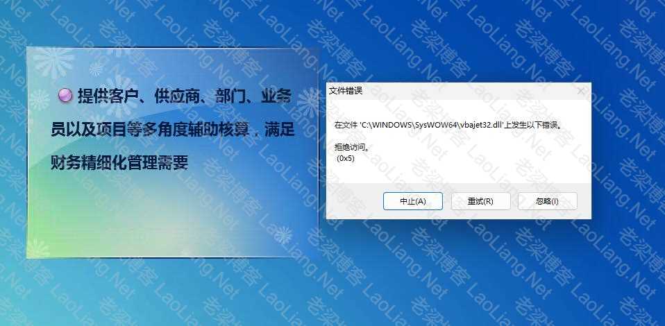 正常安装用友标准版11.2版本即可,只是安装的时候会出现“在文件'C:\Windows\SysWOW64\vbajet32.dll'上发生以下错误。拒绝访问0x5”,如下图所示