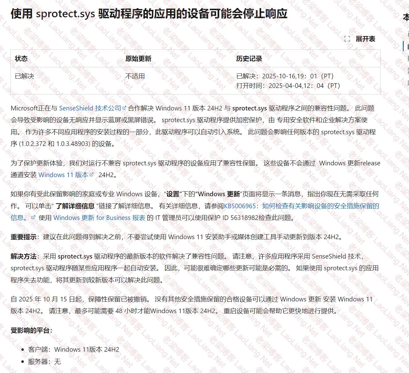网友还发了一篇文章的截图“使用sprotect.sys驱动程序的应用的设备可能会停止响应”