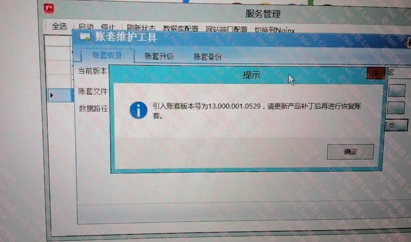 然而把版本分享给网友后,他安装完了,恢复账套竟然提示“引入账套版本号为13.000.001.0529,请更新产品补丁后再进行恢复账。”,如下图所示
