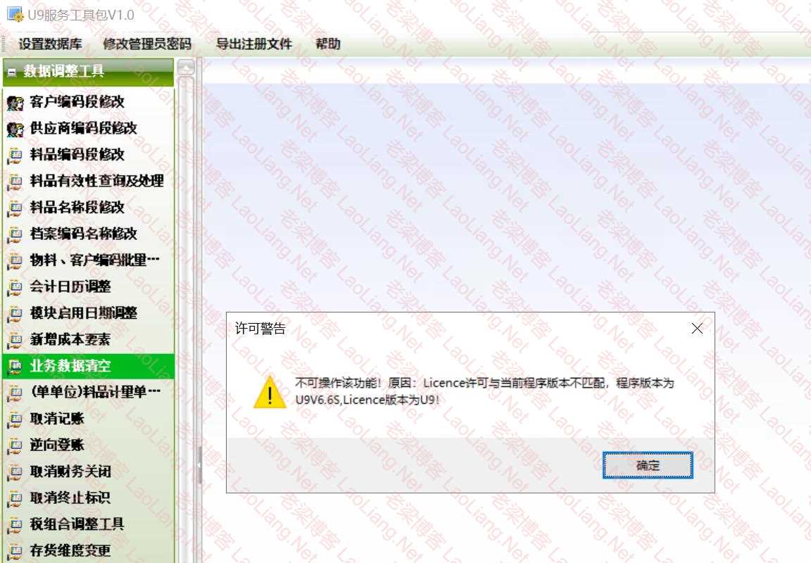 用友U9V6.6S金盘标准版打开U9服务工具包V1.0提示“不可操作该功能!原因:Licence许可与当前程序版本不匹配,程序版本为U9V6.6S,Licence版本为U9!”的说明