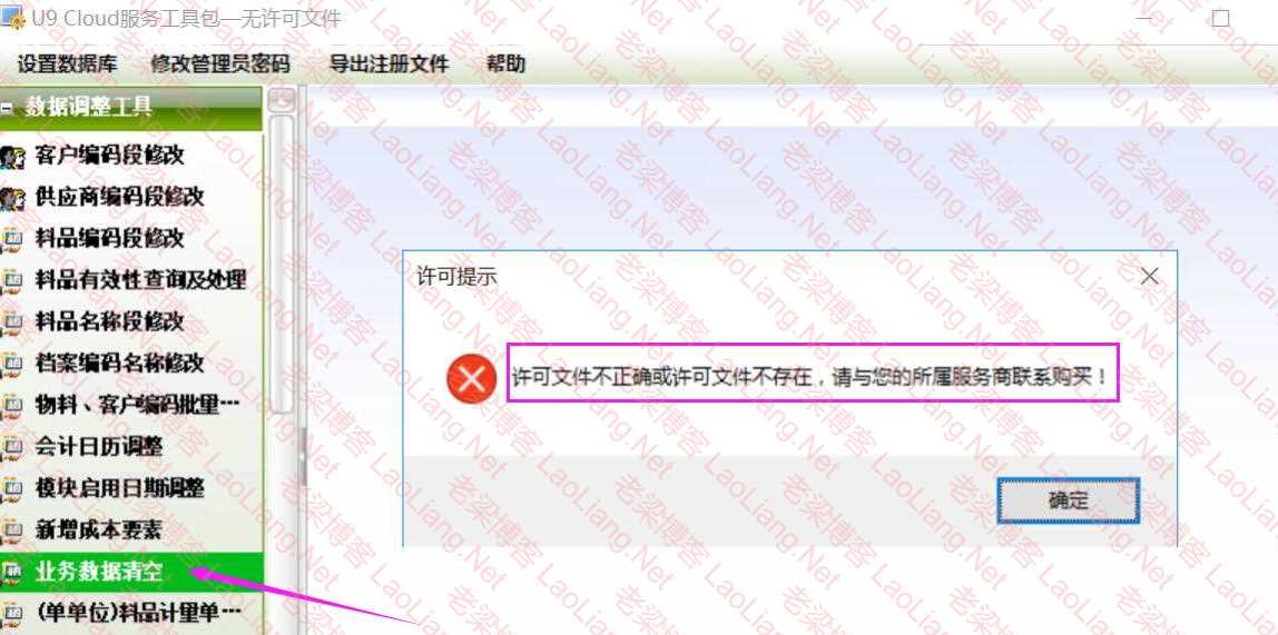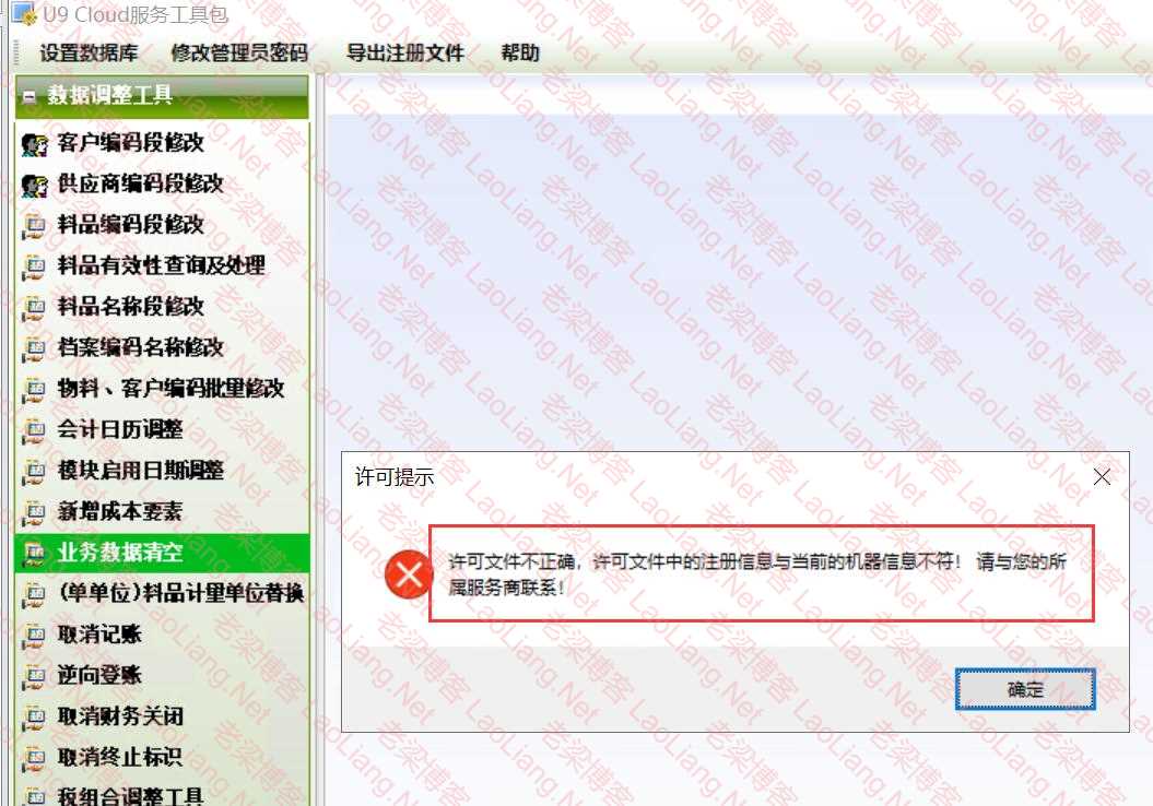 用友U9 Cloud服务工具包操作业务数据清空提示“许可文件不正确或许可文件不存在或许可文件不正确,许可文件中的注册信息与当前的机器信息不符!请与您的所属服务商联系!”的说明