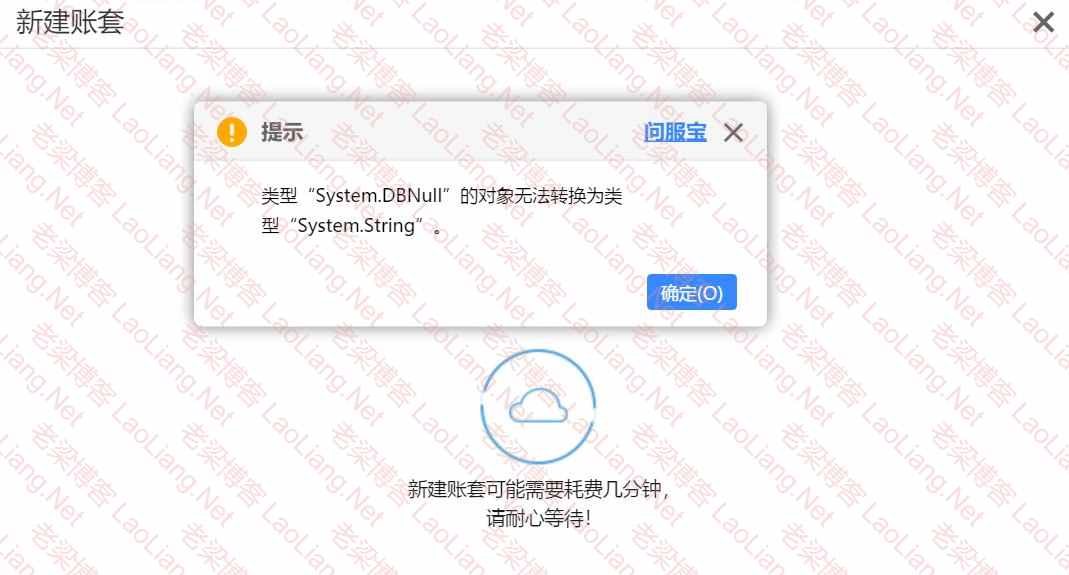有网友找到我说,他在官方下载了畅捷通T+Cloud专属云18.0(TPlus18.0专属云),然后又安装了官方18.000.000.0291补丁,然后再创建账套的最后竟然提示错误,错误为“类型System.DBNull的对象无法转换为类型System.String。”,如下图所示