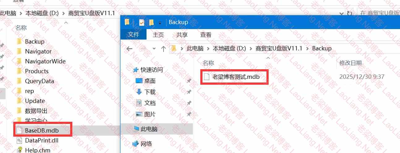 可以先将商贸宝U盘中的Basedb.mdb文件拷贝出来,然后找到Backup文件夹中最近一个时间的".abk"结尾的备份文件(比如BaseDB2025-12-30-09-37-38.abk)改成Basedb.mdb进行替换到商贸宝U盘根目录中的BaseDB.mdb文件;