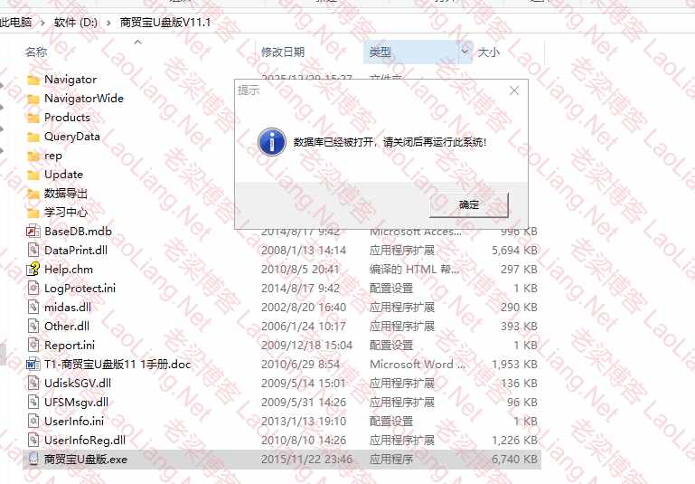 昨天有网友群里发了一张图片,是用友T1商贸宝U盘版,显示打开提示“数据库已经被打开请关闭后再运行此系统!”,如下图所示