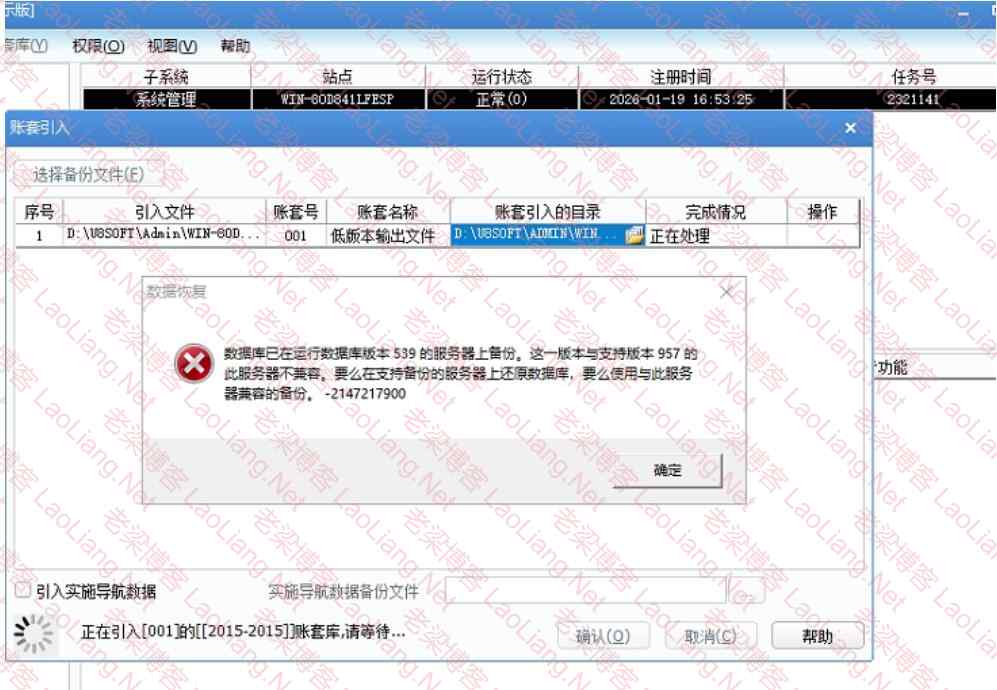 今天下午有客户找到我咨询一个问题,说在引入账套的时候提示“数据库已在运行数据库版本539的服务器上备份,这一版本与支持版本 957 的此服务器不兼容。要么在支持备份的服务器上还原数据库,要么使用与此服务器兼容的备份。-2147217900”如下图所示