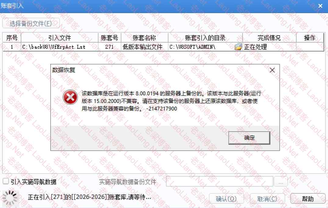 用友U8+账套引入提示“数据库已在运行数据库版本539的服务器上备份;该数据库是在运行版本8.00.0194的服务器上备份的 -2147217900”的说明