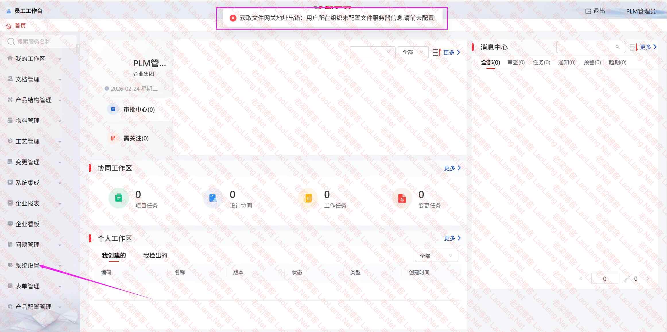 有网友在linux系统下安装部署完智石开PLM Cloud高级版,用智石开PMLC管理员登录的时候提示“获取文件网关地址出错:用户所在组织未配置文件服务器信息,请前去配置!”如下图所示