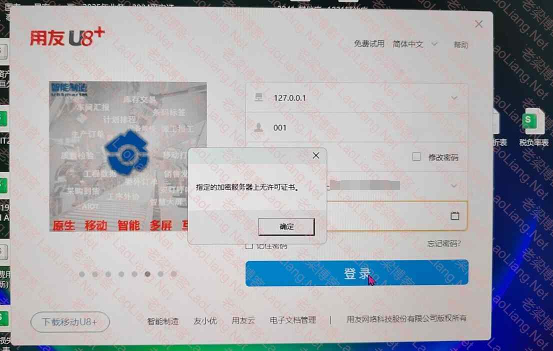 今天一早有网友找到我说他家的用友u8+16.1登录时提示‘指定的加密服务器上无许可证书,问如何处理,如下图所示
