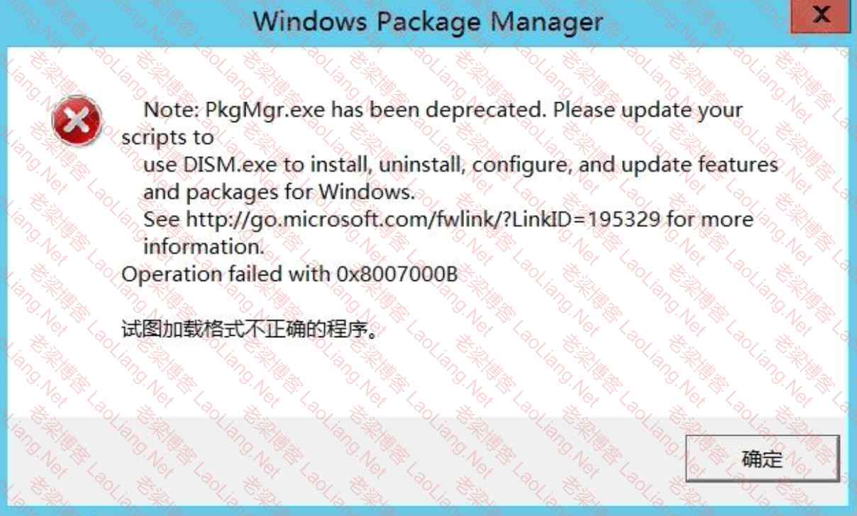 Note: PkgMgr.exe has been deprecated. Please update your scripts to use DISM.exe to install, uninstall, configure, and update features and packages for Windows. See http://go.microsoft.com/fwlink/?LinkID=195329 for more information. Operation failed with 0x8007000B 试图加载格式不正确的程序。
