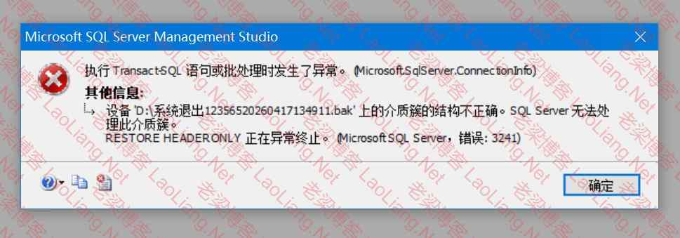 执行 Transact-SQL 语句或批处理时发生了异常。 (Microsoft.SqlServer.ConnectionInfo) 设备 'D:\系统退出12356520260417134911.bak' 上的介质簇的结构不正确。SQL Server 无法处理此介质簇。 RESTORE HEADERONLY 正在异常终止。 (Microsoft SQL Server,错误: 3241) 有关帮助信息,请单击: http://go.microsoft.com/fwlink?ProdName=Microsoft+SQL+Server&ProdVer=10.50.1600&EvtSrc=MSSQLServer&EvtID=3241&LinkId=20476