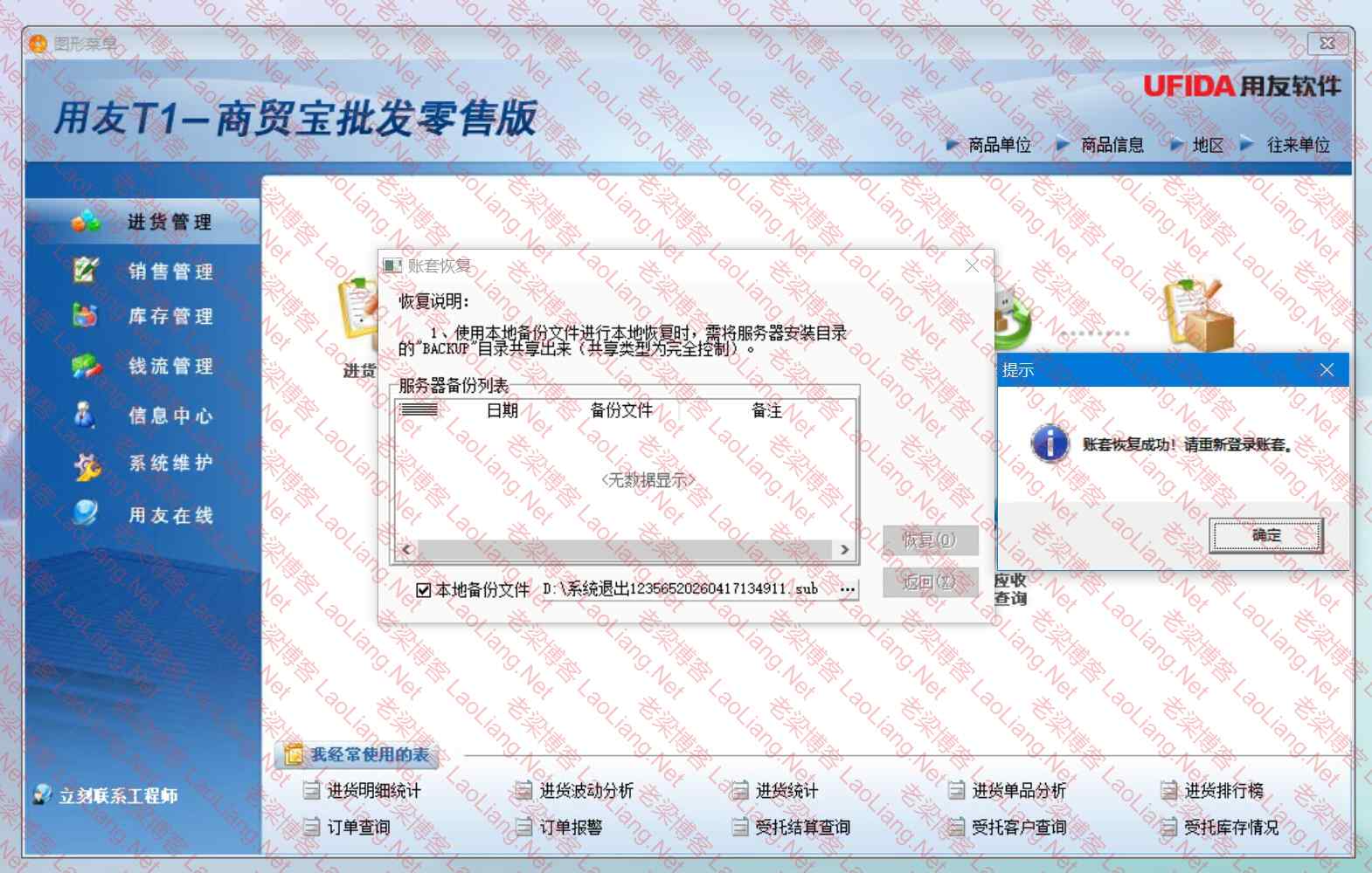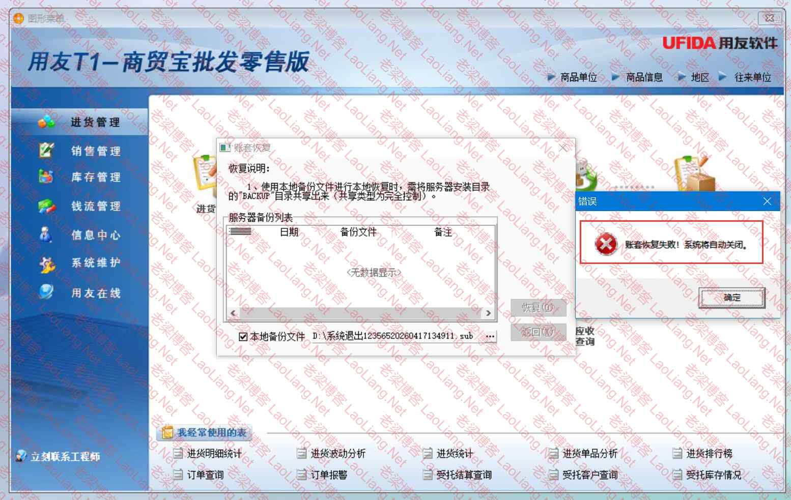 已安装用友T1-商贸宝批发零售版11.1.2.0与SQL Server2008 R2 恢复账套提示“账套恢复失败!系统将自动关闭。”怎么办?