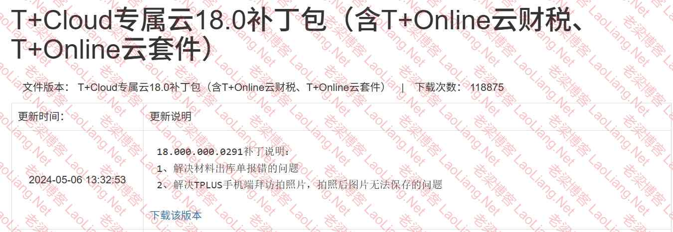 用友畅捷通T+Cloud专属云18.0补丁包(含T+Online云财税、T+Online云套件)其实就发布到了“2024-05-06 13:32:53 18.000.000.0291”如下图所示