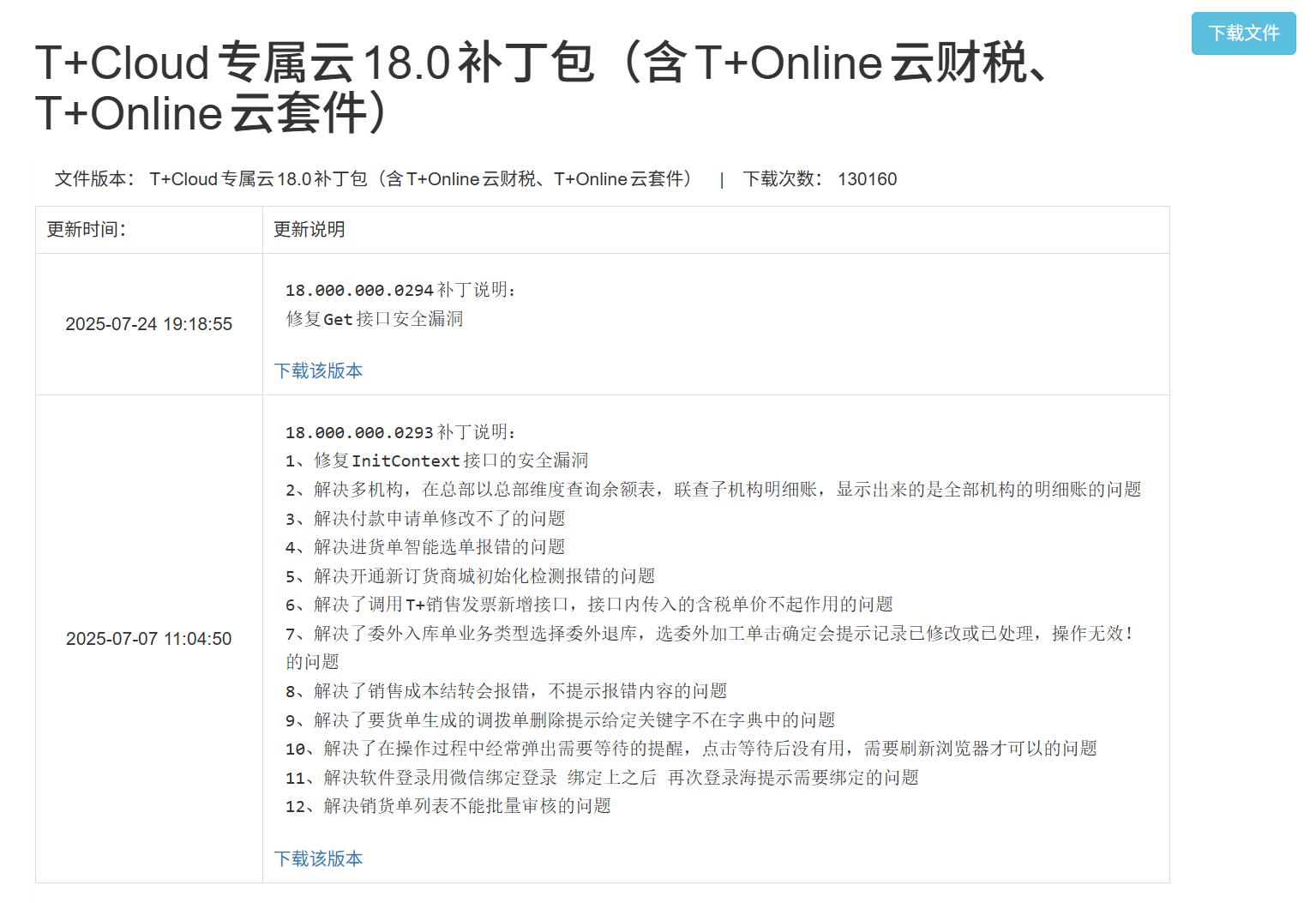 不管安装上面那一个安装包,最终官方此刻的补丁包为“2025-07-24 19:18:55”发布的18.000.000.0294补丁说明: 修复Get接口安全漏洞,当然版本号也为”用友畅捷通T+专业版 版本号:18.000.000.0294.0113“