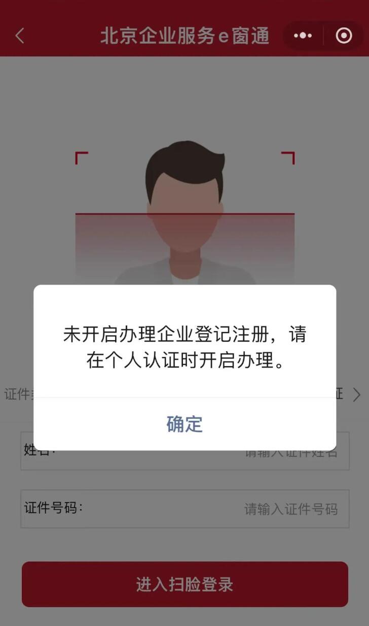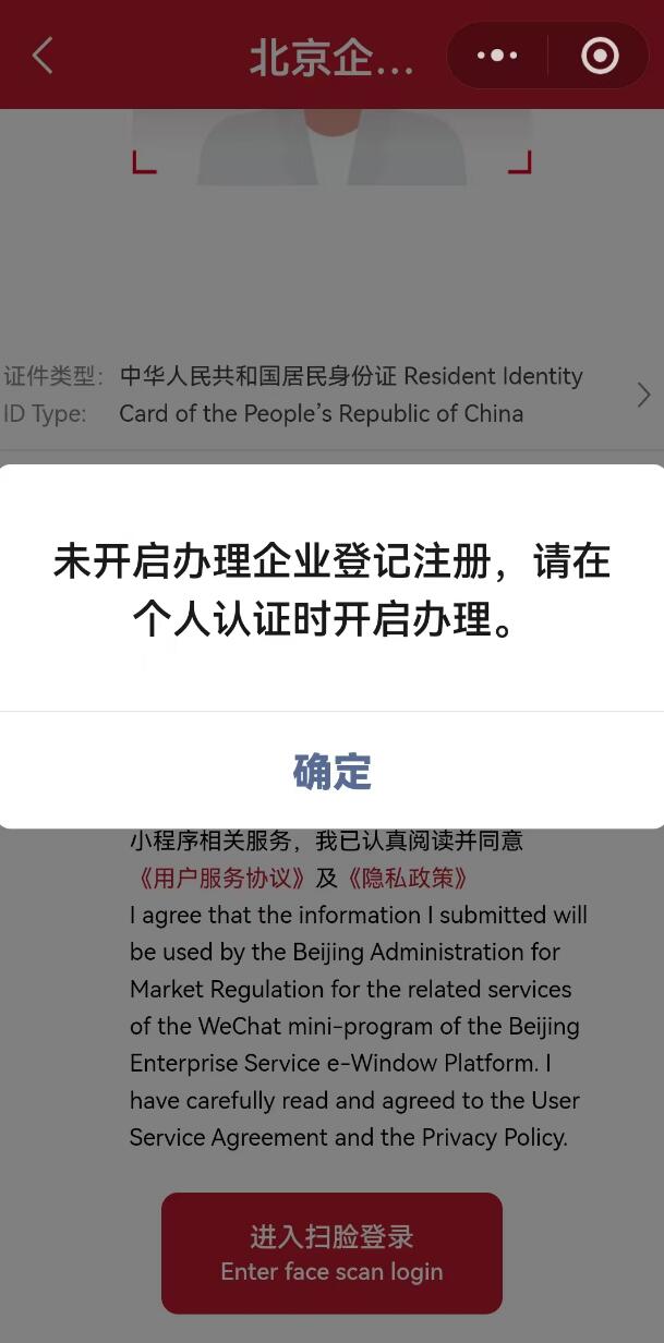 北京企业服务e窗通小程序办理业务时提示“未开启办理企业登记注册:请在个人认证时开启办理”的说明