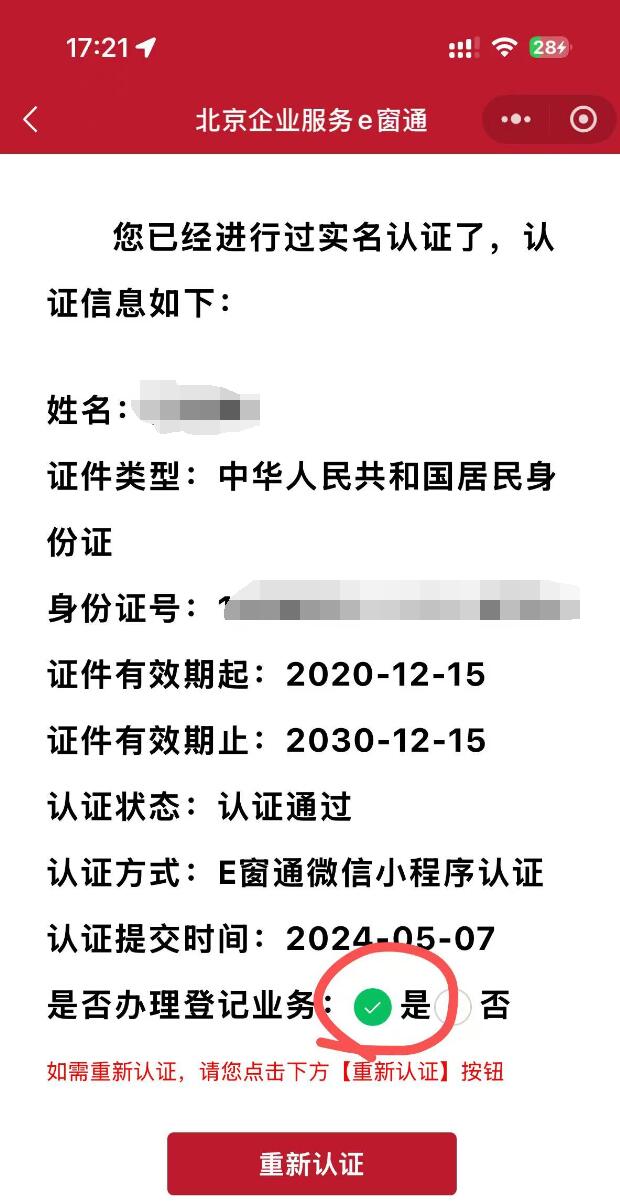 在已认证信息详情页中,您会看到关于是否办理登记业务的勾选框。请根据您的实际需求,勾选“是”或“否”,然后点击“重新认证”按钮。这一步是关键,它将会触发系统重新评估您的认证状态,并为您开启或关闭相应的企业登记注册功能。