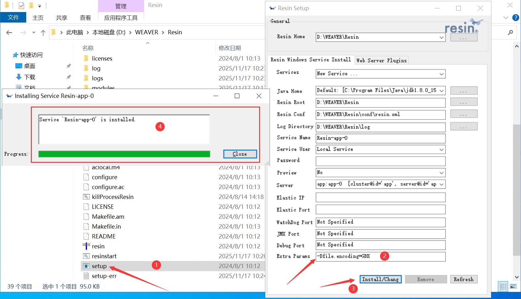 直接到“D:\WEAVER\Resin\”目录里右键管理员模式运行“setup.exe”即可,然后注意最下面的参数,一定要填写正确,然后点击“Install/Chang”即可安装服务,如下图所示;