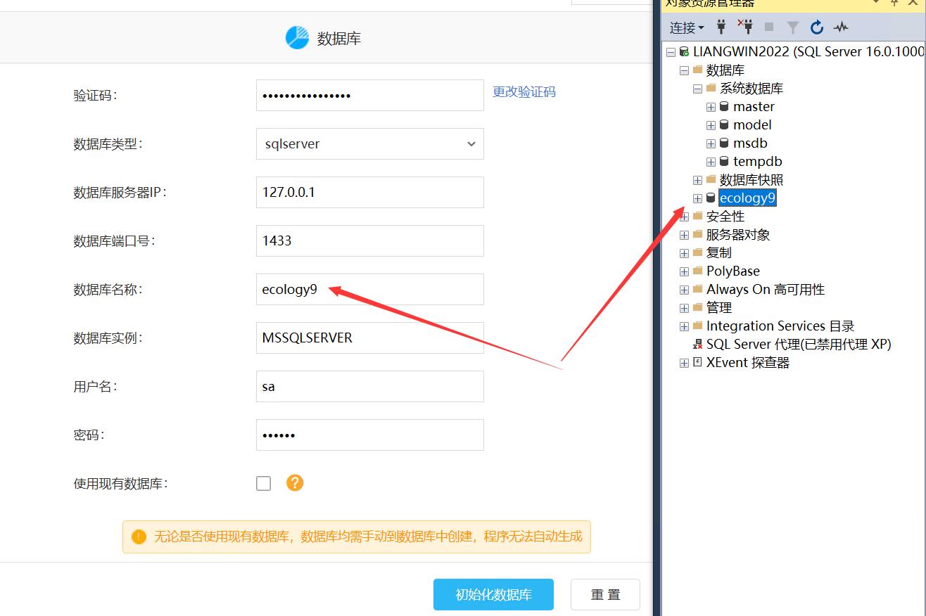 七、部署泛微Ecology9相关数据库信息,初始化数据库之前,要先创建数据库,如下图所示