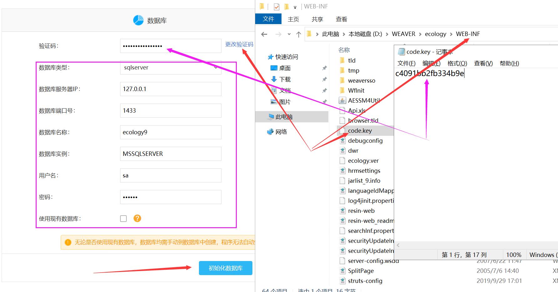 八、输入我们计算机的IP与设置的端口号即可打开初始化界面,验证码在“\WEAVER\ecology\WEB-INF\code.key”找一下即可,如下图所示