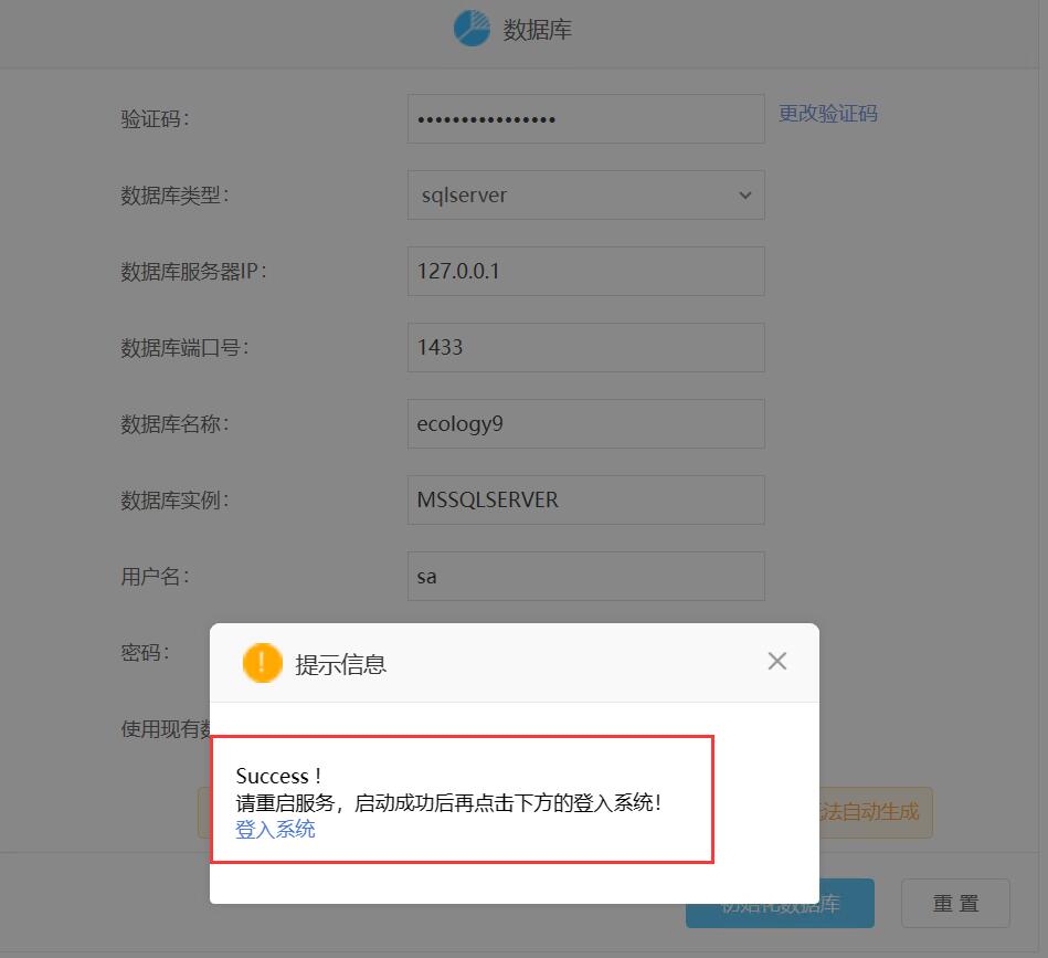 十、耐心等待后,直到出现“Success ! 请重启服务,启动成功后再点击下方的登入系统! 登入系统”就算初始化数据库完成,如下图所示
