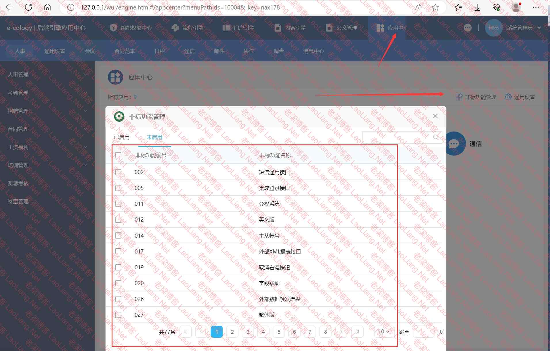 6、登录成功后,直接在泛微e-cology后端引擎应用中心,找到非标功能,启用相对应的非标即可,如下图所示