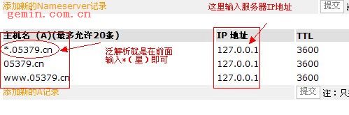 如上图所示:在域名管理处,添加A记录,在主机名框中输入* ,ip地址输入你的网站所在服务器的IP地址即可,这样就完成了域名泛解析。
