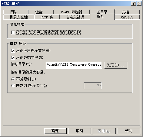 首先,如果你需要压缩静态文件(HTML),需要在硬盘上建一个目录,并给它“IUSR_机器名”这个用户的写权限。如果压缩动态文件(PHP,asp,aspx)就不需要了,因为它的页面是每次都动态生成的,压缩完就放弃。然后在IIS管理器中,“网站”上面右键-属性,不是下面的某个站点,而是整个网站。进入“服务”标签,选上启用动态内容压缩,静态内容压缩。