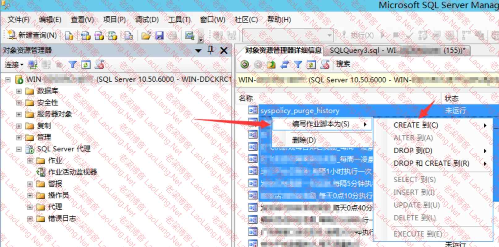 2、选中需要的作业然后右键--编写作业脚本--create--后所有Job会以SQL脚本的方式显示在查询窗口中或直接导出作业即可,如下图所示