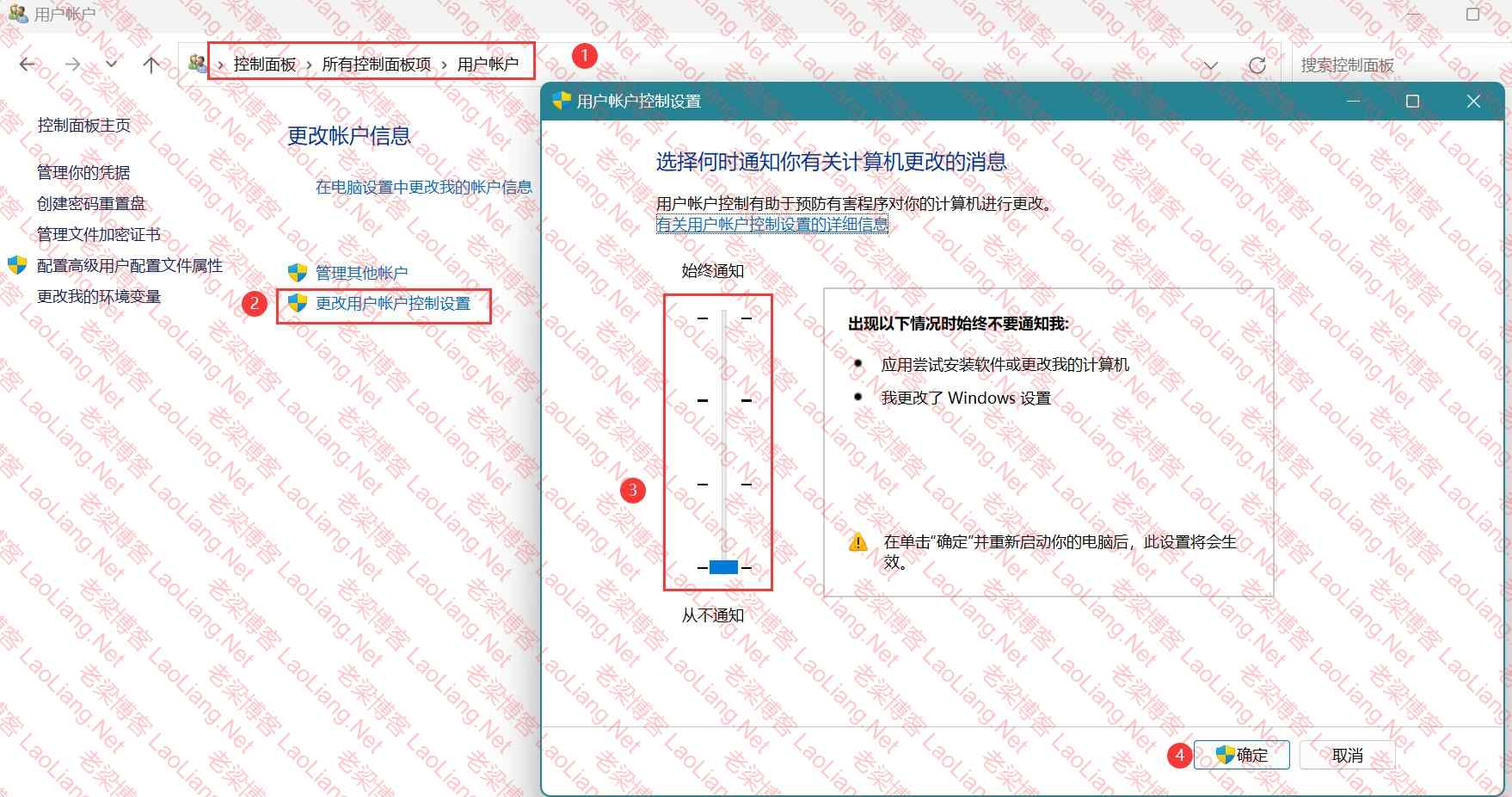 开始---控制面板---所有控制面板项--用户账户--更改用户账户控制设置---拉到最低--从不通知即可,如下图所示