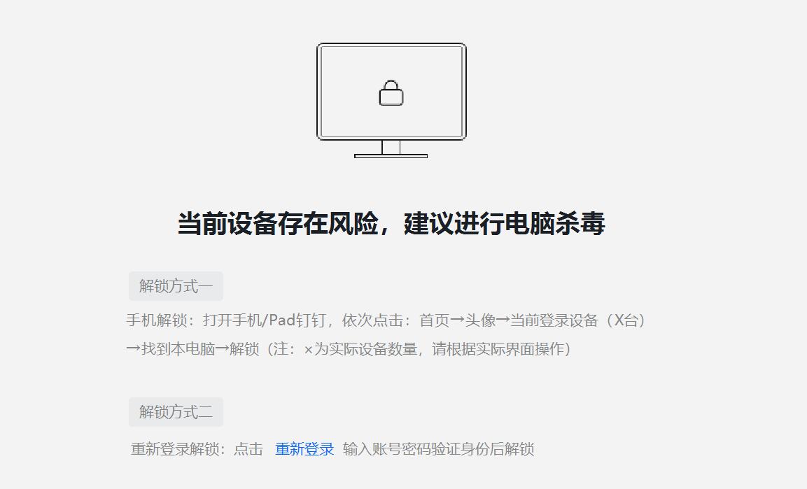 钉钉电脑端提示“当前设备存在风险,建议进行电脑杀毒-找到本电脑-→解锁”的说明