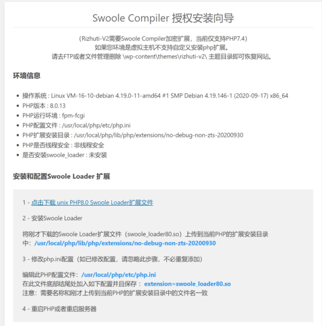 在安装一些web站点的时候,经常会弹出窗口让安装Swoole Compiler加密扩展(Swoole加密)方可使用,尤其是一些wordpress授权主题;在没有安装Swoole Compiler加密扩展的时候会看到有这样的安装向导提示,如下图所示